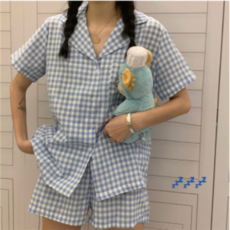 주니도니 체크 셔츠형 반팔 잠옷 파자마 상하 세트