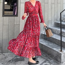 쩐쿠 가을 여성 라운드넥 긴소매 옆리본 롱 원피스 8316