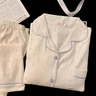 무니유유 여성 가벼운 구름면 카라넥 긴팔 수면 잠옷 상하의 세트