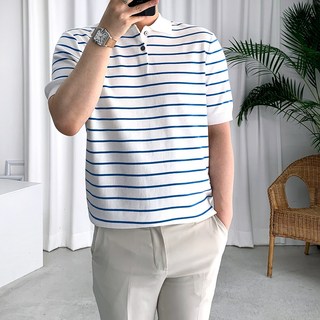 룩플레인 여름 스트라이프 반팔 니트 카라 티셔츠