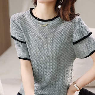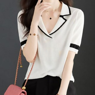 데일로엔 여성 카라넥 배색 심플 반팔 니트티