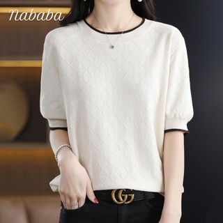 나바바 NK1380 여성 마름모 라인 배색 반팔 니트티