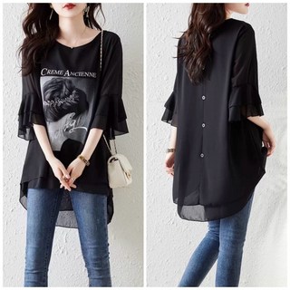 WEIHAN 빅사이즈 여성 오버핏 쉬폰 반팔 티셔츠 캐주얼 프린트 언발 반팔티 데일리룩