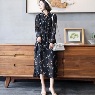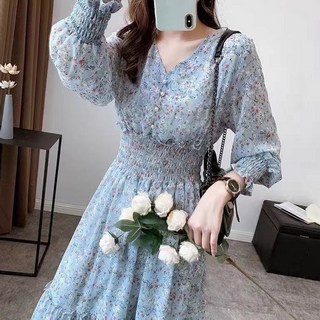 ANYOU 여성 쉬폰 원피스 봄가을 긴팔 밴딩 브이넥 분위기 플라워 롱원피스