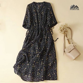 POMTOR 봄 여름 칠부소매 롱 원피스 여성 플라워 휴양지 원피스