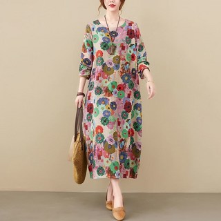 여름 롱원피스 중년 여성 플라워 프린트 캐주얼 루즈핏 라운드 긴팔 원피스 바캉스룩