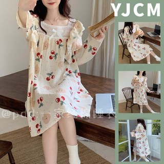 COSYEVNO 여성 잠옷 세트 봄 가을 면 프린트 원피스 실내복 투피스