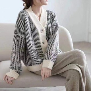 가을 프리미엄 레트로 스트라이프 러그래 니트 가디건 오버핏 두꺼운 니트
