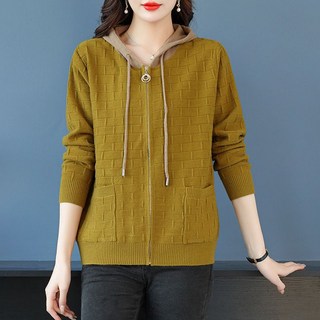 ORZQU 여성 봄가을 중년 니트 집업 카디건 아우터 후드 루즈핏 숏 니트
