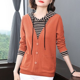 AOKADA 중년 여성 레이어드 스트라이프 후드티 가을 엄마 긴팔 티셔츠