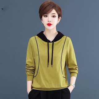 AOKADA 중년 여성 루즈핏 배색 후드티 순면 긴팔 티셔츠