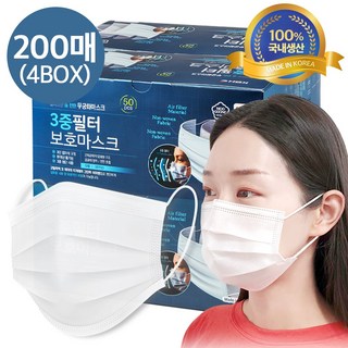 무궁화 3중 필터 보호 일회용 마스크 성인용 흰색 대형, 50개입, 4개
