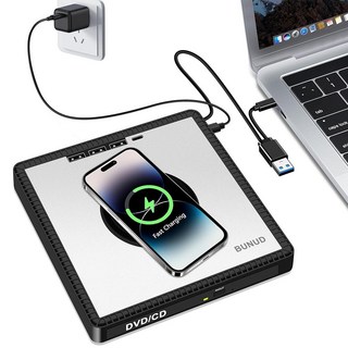 무선 충전기가 있는 BUNUD 외장 DVD 드라이브: iPhone 12-16/Apple Watch/AirPods용 고속 충전 휴대용 USB CD 버너 플레이어 SD/TF/3개