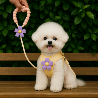 [강아지 하네스 세트] 귀여운 꽃 리드줄 쿠션 손잡이 경량, 옐로우, 1세트