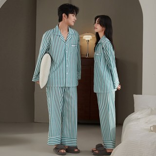 레베로프 250736 스트라이프 파자마 긴팔 긴바지 상하세트 여성 남성 커플 잠옷 홈웨어 그린 민트