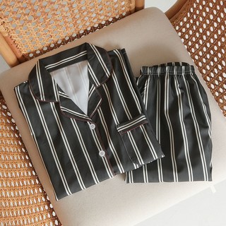 레베로프 250731 씬 스트라이프 파자마 긴팔 긴바지 상하세트 여성 남성 커플 잠옷 홈웨어 올리브
