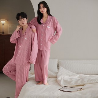 레베로프 250747 씬 스트라이프 파자마 긴팔 긴바지 상하세트 여성 남성 커플 잠옷 홈웨어 라즈베리