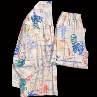 여성용 레트로 그래피티 프린트 체크 패턴 파자마 세트 긴팔 수면잠옷 사계절 통용 빈티지 스타일 홈웨어