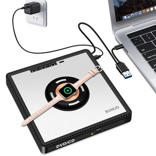 BUNUD 무선 충전기가 있는 외장 DVD 드라이브: 아이폰 12-16/애플 워치/에어팟 휴대용 USB CD 버너 플레이어 플러그 앤 플레이 SD/TF/3 포트가 노트북 맥 윈