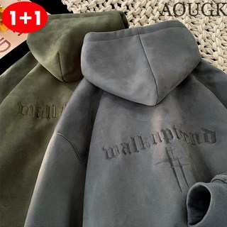 AOUGK 1+1 남성 스웨이드 후드 맨투맨 빅사이즈 롱 후드티 오버핏 긴팔 티셔츠 자수 코트 데일리