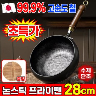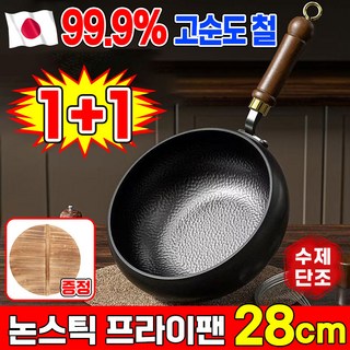 [수제] 순철 논스틱 프라이팬 99.9% 고순도 철 무코팅 가마솥 인덕션 후라이팬 무코팅 건강 냄비 철분 보충, 1개, 냄비 28cm(나무뚜껑 증정), 사진참조