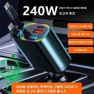 SUNRIVER 차량용 초고속 충전기 240W 릴타입 C타입 2개 애플 변환 잰더 포함 3세대 4in1 PD USB CC타입 12V 180W 차량 전용 120W 24V차량 전용, 240W/앰레인보우 램프+C타입to애플 변환 젠더