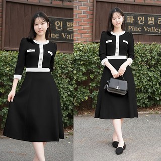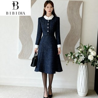 비비디아 여성 봄가을 오피스룩 배색 슬림 원피스 정장 스타일 미디 드레스 출근룩5576