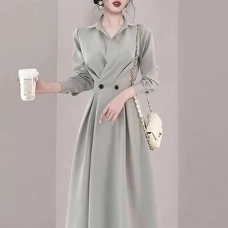 POMTOR 여성 봄 가을 하객룩 프렌치 A라인 카라 긴팔 롱 원피스 데이트룩 데일리룩