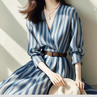 AOKADA 여성 봄 가을 브이넥 스트라이프 하객룩 오피스룩 밸트 롱 셔츠 원피스