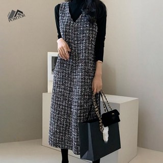 POMTOR 여성 트위드 민소매 롱 원피스 여성 겨울 데일리 원피스
