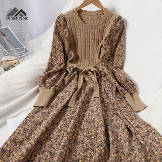 POMTOR 여성 가을겨울 플라워 니트 코르덴 원피스 라운드 오버핏 긴팔 원피스