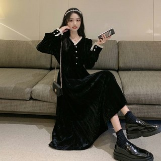 타니즈 여성용 소프트 벨벳 리본타이 연말룩 격식룩 롱원피스