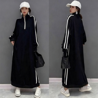 오스틱니 [150kg까지 날씬해보이는] 원피스 여성 가을 스트라이프 반집업 칼라 제인드 맨투맨 오버핏 이너 긴팔 캐주얼 패션 데일리 클래식배색 빅사이즈 오버사이즈 롱 원피스