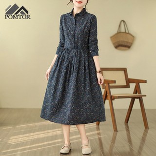 POMTOR 봄 가을 여성 플라워 긴팔 원피스 면 린넨 터틀넥 허리 조임 미디 체형커버 원피스